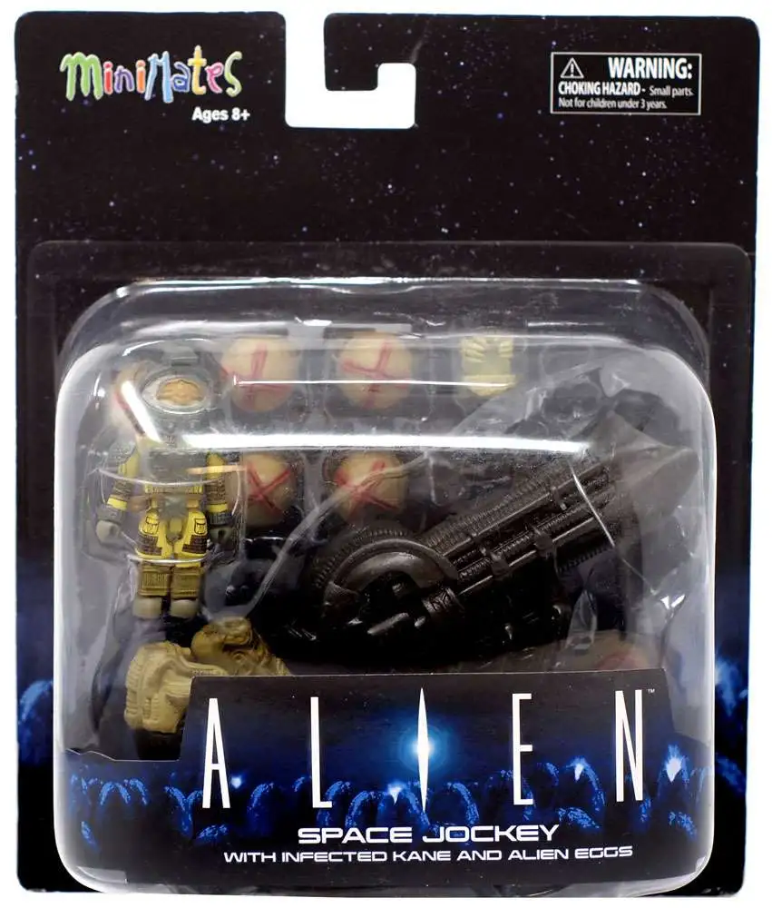 The Aliens Deluxe Minimates line continues with a third Deluxe release, the Alien Space Jockey, as seen in the 1979 film that started it all! This diorama-style piece measures over 4 inches tall and comes with an exclusive 2 inch mini-figure of Nostromo crew member Kane, wearing his environmental suit with melted face plate, plus multiple alien eggs. Kane is fully poseable with 14 points of articulation, a removable helmet and interchangeable parts, including a facehugger alien! Fully compatible with all Alien and Predator. Packaged on a full-color blister card.