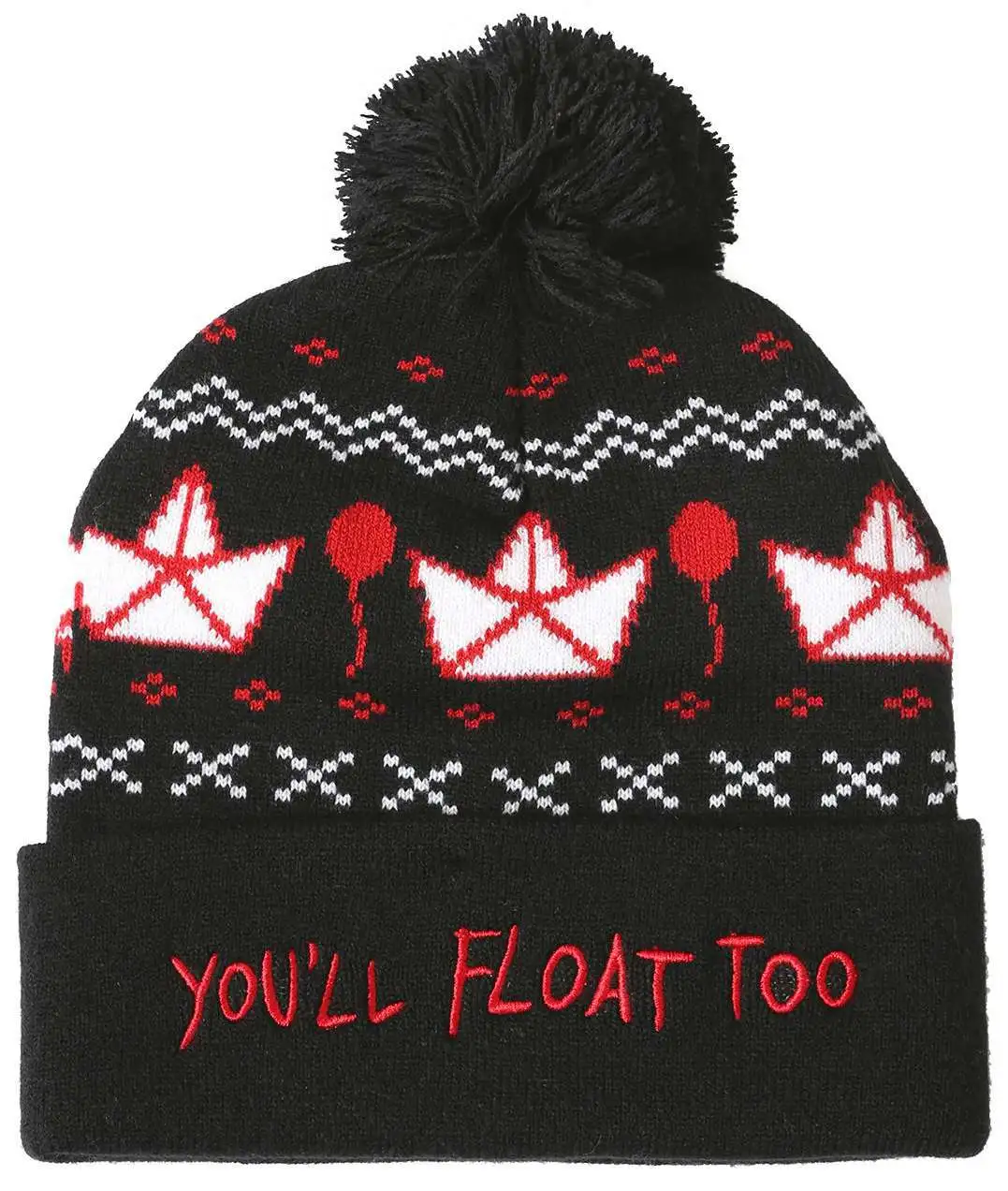 Derry, Maine can get pretty cold in the wintertime. Stay warm with this beanie inspired by IT with S.S. Georgie paper boats and red balloons. Features “You’ll float too” embroidered across the brim and a black pom on top.