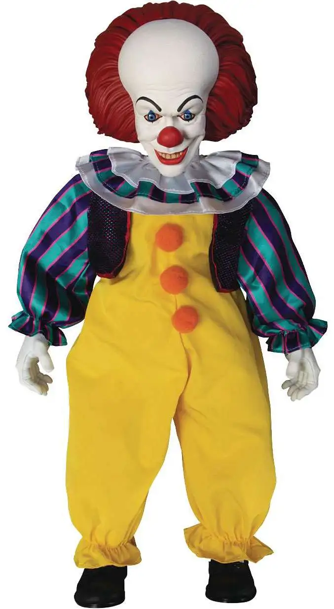 Sporting a maniacal grin, Pennywise is 18 tall, features sculpted parts on a floppy plush body, and wears his signature clown suit from the classic made-for-TV miniseries, IT.