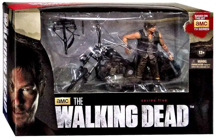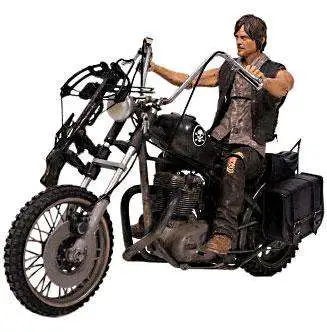 Fan favorite Daryl Dixon, from AMC’s hit television series The Walking Dead, is a lone wolf survivalist who has proven time and again to be a vital sentinel for Rick Grimes and his group in an unpredictable and perilous apocalyptic world. This deluxe box set features Daryl Dixon with his iconic chopper motorcycle. The 5-inch tall figure’s exact likeness is created using a full 3D scan of the actor himself, Norman Reedus! This sculpt portrays Daryl in his angel wings stitched biker vest and includes approximately 20 points of articulation, hunting knife and updated crossbow. Daryl’s transportation of choice in this apocalyptic world is his brother Merle’s black chopper motorcycle. The first vehicle produced for The Walking Dead action figure line, this iconic chopper includes the lightning-bolt insignia on the tank, skull decal, and saddlebags.