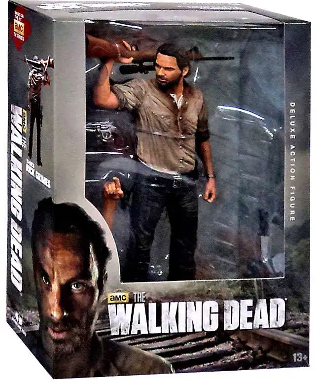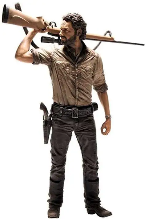 The McFarlane Toys Rick Grimes Deluxe Figure is inspired by The Walking Dead Season 3 key art, as Rick stands watch, ready to defend his family, friends, and new home. This highly detailed 10-inch figure features the exact likeness of the actor, taken from a full 3D scan of the actor himself, Andrew Lincoln.