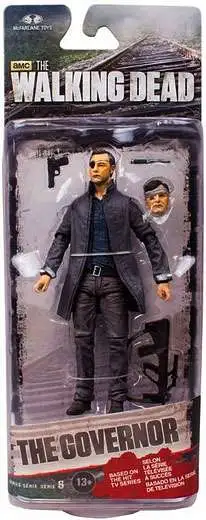 The once leader of the seemingly utopian town of Woodbury, The Governor has lost everything: the town he built; his daughter turned walker; and his eye at the hands of Michonne. Longing for revenge against Rick and his group of survivors, The Governor rose from the ashes of defeat to become an even more dangerous foe for anyone or anything that stands in his way. This figure comes with approximately 22 points of articulation, eye patch head, bandaged head, and automatic rifle.