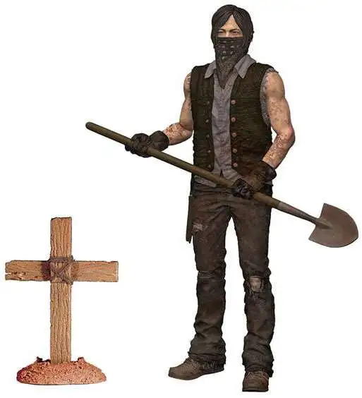 If the apocalypse has taught us anything, its that you are never safe…even from the flu. Daryl Dixon, a long-time survivor within Ricks group, has become a pillar of support for those who came to rely on him. If that means burying the dead, then so be it. This version depicts a dirt-covered Daryl from the Season 4, wearing his gloves and bandana while digging the grave for another fallen companion. The figure also includes approximately 22 points of articulation, wooden cross/grave marker, and shovel.
