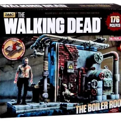 Rick Grimes spent plenty of time down in the Prisons boiler room during season 3 of AMCs The Walking Dead. This dreary room was the setting during his daughter birth and wifes tragic passing. After learning of his wife death, Rick discovers a fat, lethargic walker sitting where his wifes corpse should be. After killing the walker again, Rick begins to be haunted by the imaginary cries of a baby and a ringing phone. Fans can now build the Prison Boiler Room construction set and recreate this emotional scene between Rick, a walker and a phone! Each construction set includes completely buildable boiler room scene environment with boiler, piping, valves, workshop bench and accessories, and Ricks iconic phone. Also contains Rick Grimes with pistol and lethargic seated