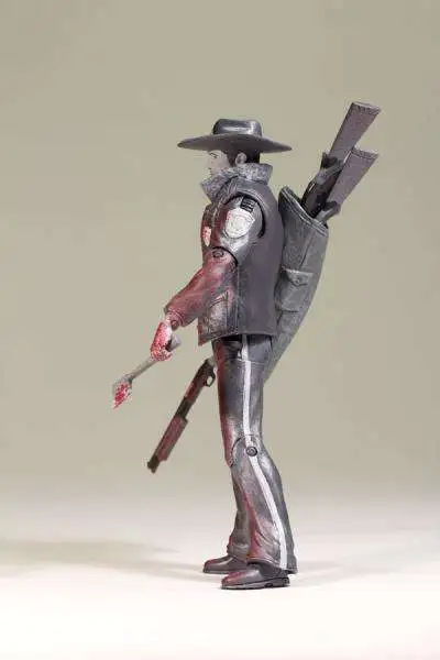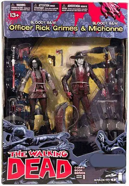 With civilization itself tottering after the outbreak of the zombie plague, former police offier Rick Grimes leads a group of survivors in search of shelter and safety as zombie hordes roam the countryside in Robert Kirkman’s best-selling comic book, The Walking Dead, from Image Comics. Fans of the series can add this Exclusive two-pack to their collection with Officer Rick Grimes (includes bag of weapons) and Michonne (comes with sword and tools of revenge). Each figure is highly articulated and features a sculpt based on the artwork from the best-selling series.