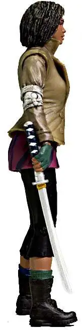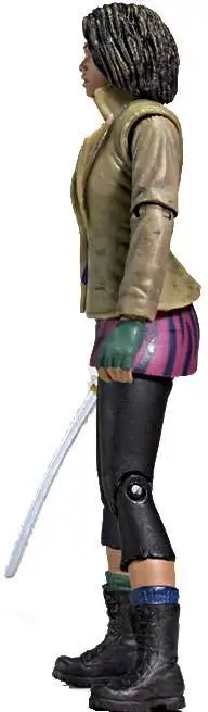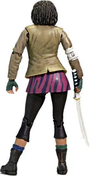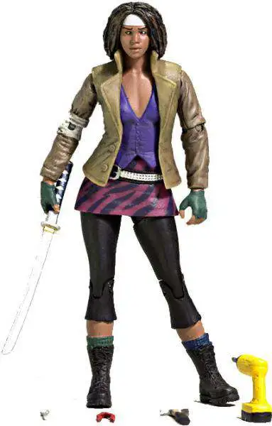 Michonne, inspired by the cover of The Walking Dead comic book issue #19, is fully accessorized for all of her unforgettable acts of vengeance to come. Figure comes with her signature katana sword and various implements of revenge including a power drill, hammer, pliers, and spoon. Features approximately 22 points of articulation.