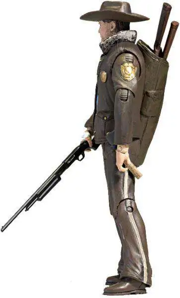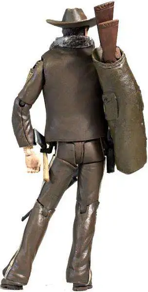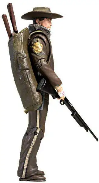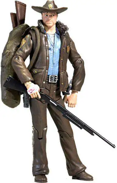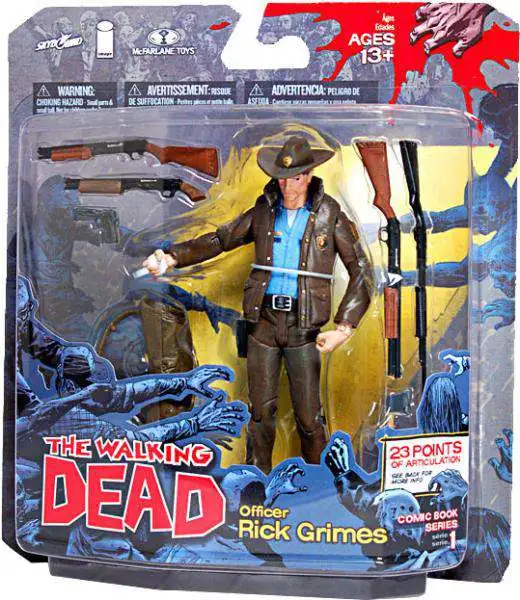 Officer Rick Grimes, inspired by the cover of The Walking Dead comic book issue #1, is in his police officer uniform, complete with cowboy hat and jacket. Figure comes with his signature axe and pistol weapons, plus a police duffel bag with removable shotguns. Features approximately 20 points of articulation.