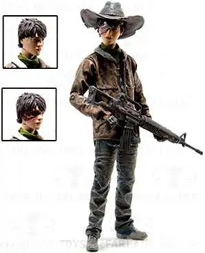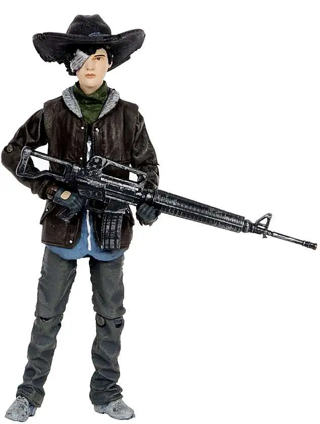 Battle hardened from the loss of life around him, Carl Grimes was forced to grow up fast in this zombie-ridden apocalyptic world. Carl continues to be one of the most formidable survivors, yet struggles to retain his humanity because of it. While the Safe-Zone was being overrun by zombies, Douglas Monroe fired off frantic shots while being devoured…one of those stray bullets hit Carl in the eye, nearly killing him. Carl pulled through, but was left blinded and scarred on the right side of his face. Our figure features the bruised and battered Carl Grimes in his classic button up shirt, scarf, and two alternate heads – one displaying the bloody bandage wrapped around his head, as well as a head that shows the damage from the bullet. The figure also includes an assault rifle, and a removable sheriff hat.