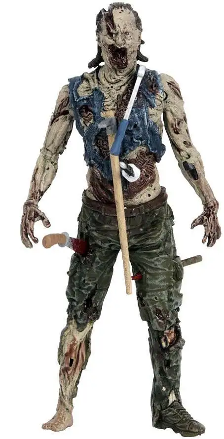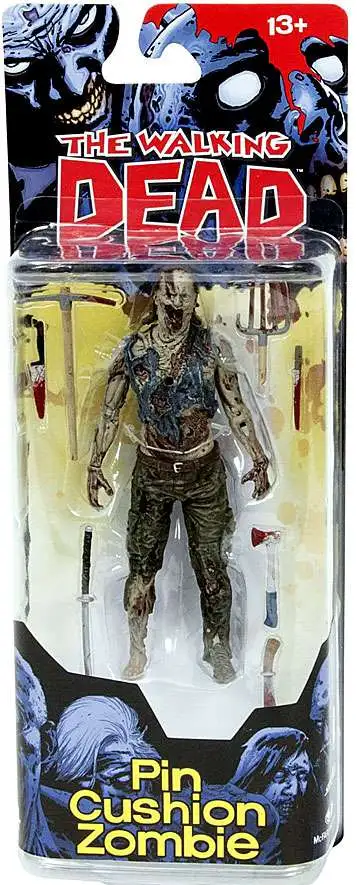 When first encountering a roaming zombie, not everyone instinctively knows what to do to kill it. Everything required trial and error, and one thing this Pin Cushion Zombie is familiar with is error. Whomever encountered this lumbering roamer obviously had no idea you were supposed to go for the brain (Duh). Im sure this guy got a good snack for his troubles. Our zombie figure exhibits the many failed attempts to kill him with numerous weapons. The figure includes a pitch fork, two hunting knives, classic Knife, kitchen knife, katana, and hatchet.