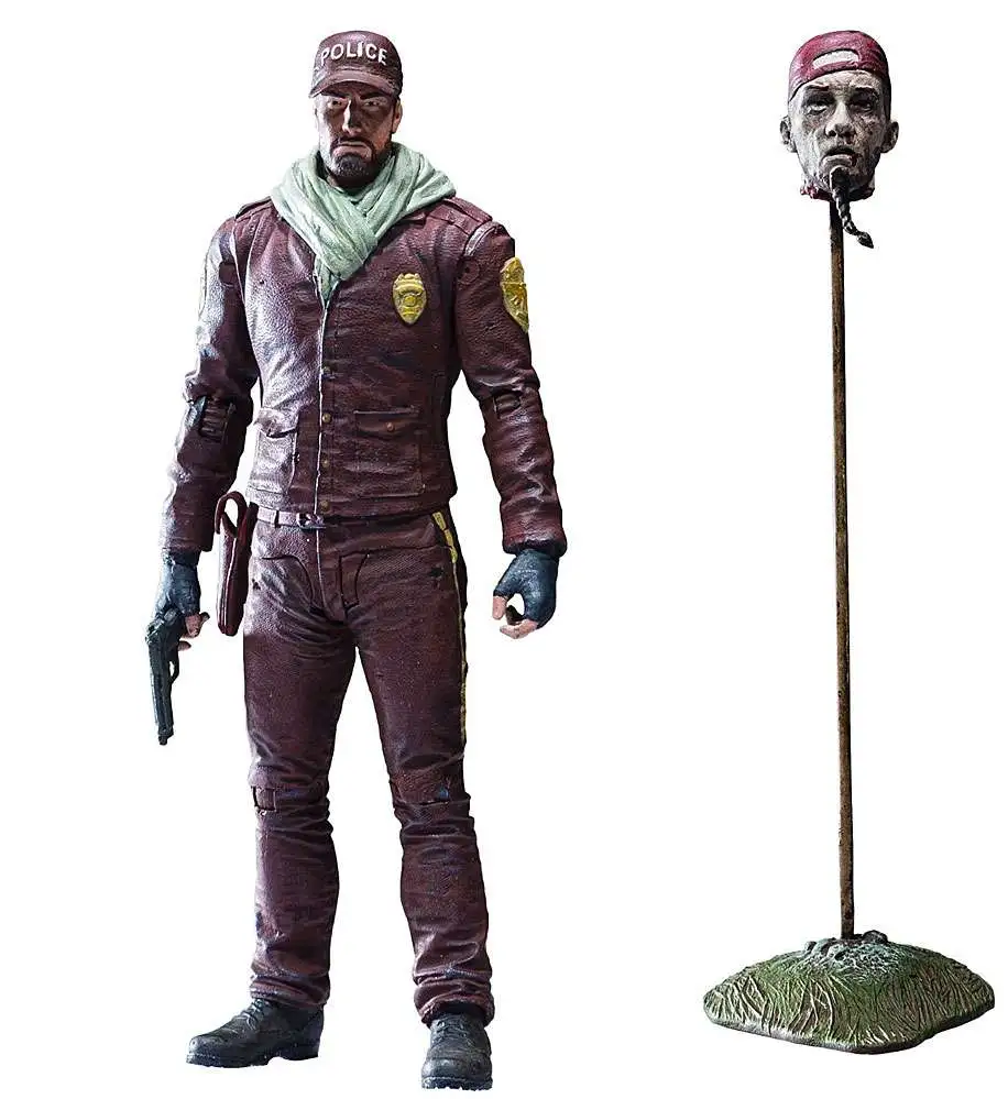 Former Sheriff Deputy along with Rick Grimes, Shane was responsible for keeping Lori and Carl Grimes safe when the outbreak occurred. When it became apparent Atlanta was lost to the Walkers, Shane took the two and settled on the outskirts of the city joining up with Dale and his band. As an authority figure he became the de-facto leader of the group. Shane acted on his long time feelings for Lori, as they both assumed Rick was probably dead. However when Rick showed up, Lori confessed it was a moment of weakness and a mistake. His obsession with Lori greatly impacted his emotional state and caused him to pit himself against his former friend. Eventually the tension grew too high between the two, and Shane attempted to kill Rick. Before Shane could act, he was shot and killed by Carl Grimes trying to protect his father. After Rick later learns everyone is infected he returns to Shanes grave to find him reanimated. He shoots him in the head thus ending his second life. Figure features Shane dressed in his police uniform and baseball cap. Comes with 22 Points of articulation, an alternate zombie head, his signature shotgun, and a severed Oscar head on a stake with base, as homage to the recent events in the comic.