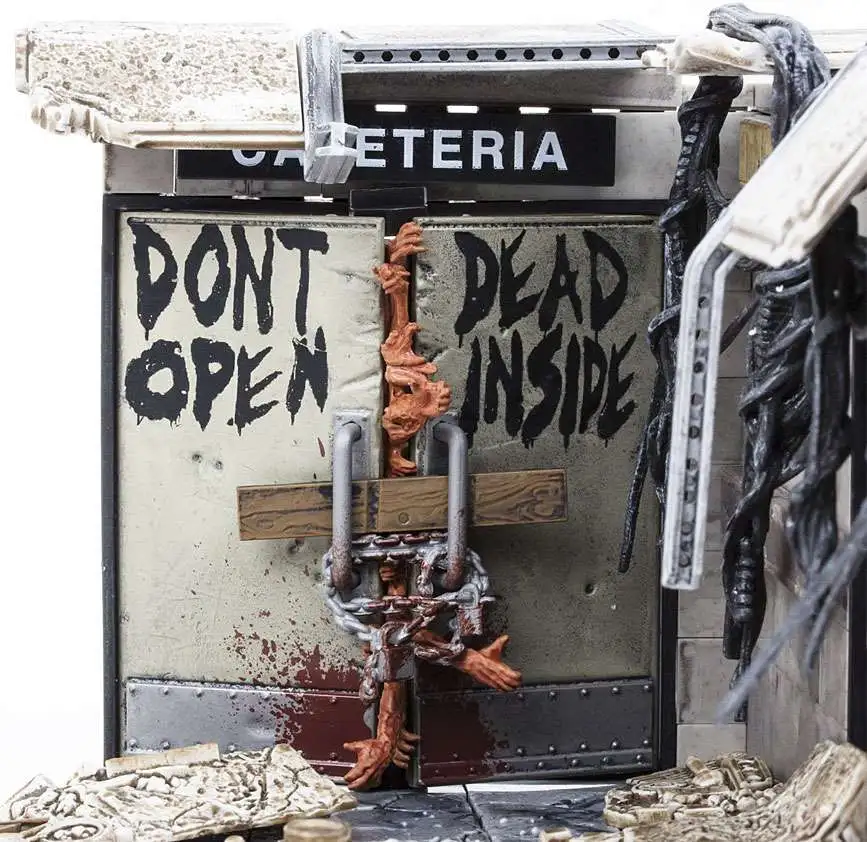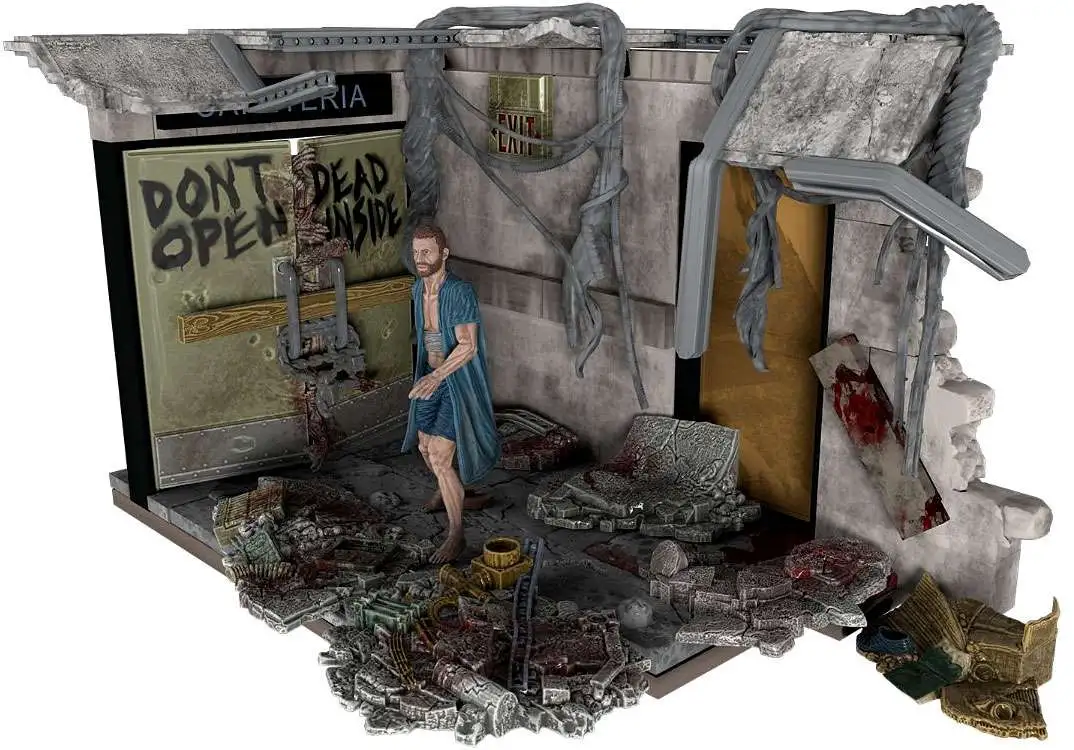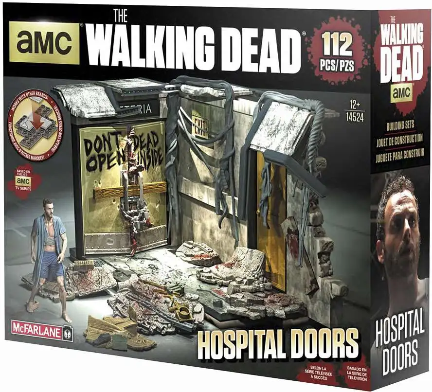 This Walking Dead Hospital Doors Construction Set brings the memorable pilot episode to the forefront. After being shot on duty and falling into a coma, Rick Grimes awakens to find himself in a hospital bed with no one in sight. Alone, weak and disoriented, Rick stumbles through the hospital looking for any signs of life. Upon reaching the boarded and locked up cafeteria doors, it is quite apparent to Rick that this is not the same world he once knew: Don’t Open, Dead Inside! Recreate one of the most iconic scenes from AMC’s The Walking Dead with the Hospital Doors construction set! Each construction set includes buildable hospital doors scene environment featuring chained cafeteria doors with reaching Walker arms and “Don’t Open, Dead Inside” graffiti, partial hospital hallway, debris, and hanging cables. Also contains Rick Grimes in his hospital gown. The set, in total, is 112 pieces.