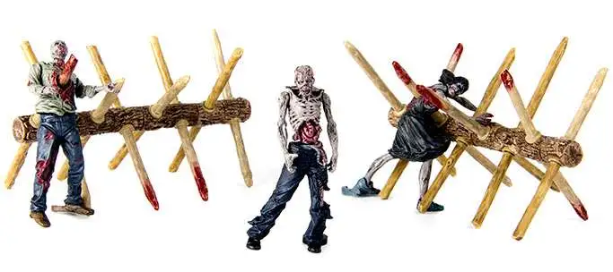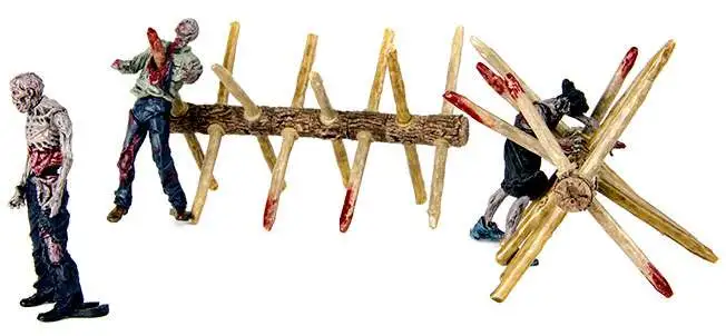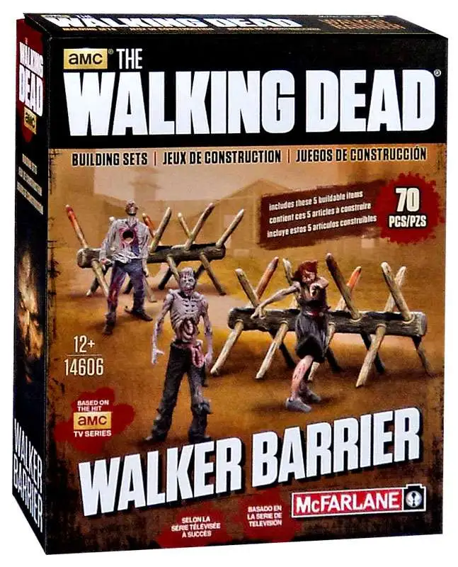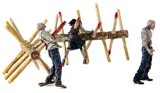 The walker barrier building set includes two stake barriers, along with two male walkers and one female walker. Two walkers can even be impaled on the bloody spikes.