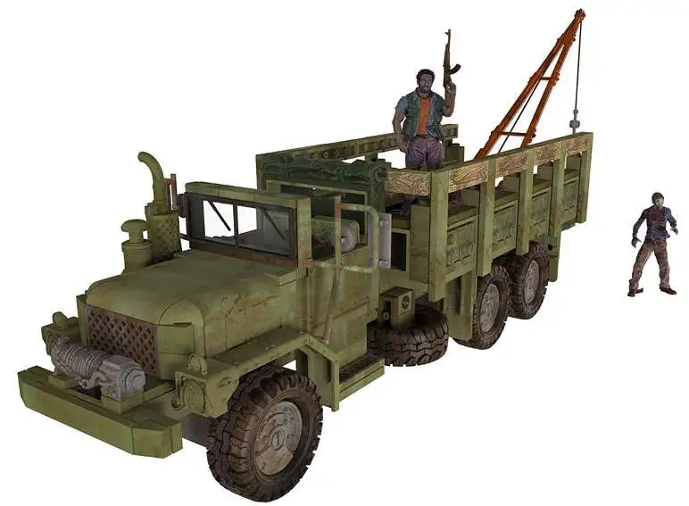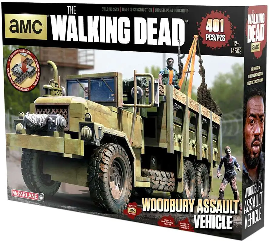 Vehicles are a extremely valuable tool during an apocalypseassuming they still have gas. During season 3 of AMC’s The Walking Dead, The Governor and his Woodbury survivors took every opportunity to procure these assets – including some camouflage military trucks. Now you can build your own military transportation with the Woodbury Assault Vehicle construction set! Whether you’re picking up walkers from the pit traps or attacking nearby survivors at a prison, this versatile vehicle can handle all your construction needs! Each construction set includes a fully buildable assault vehicle with mud flaps and wood paneling accent details, along with functioning wheels, doors, Walker net and crane. Also contains Shumpert figure (with interchangeable sitting legs) and one netted Walker figure. The set, in total, is 401 pieces.buy = ‘Y’;