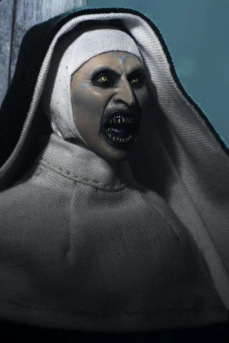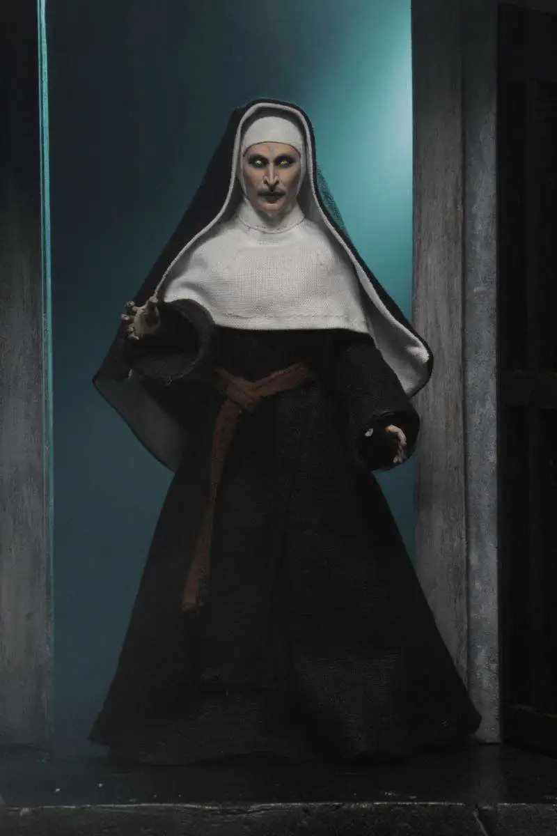 This clothed figure is based on the demon’s manifestation as a nun and features a full fabric habit. It stands 8″ tall, is fully articulated and comes with an additional interchangeable head when you want to take the horror up a level! Window box packaging.