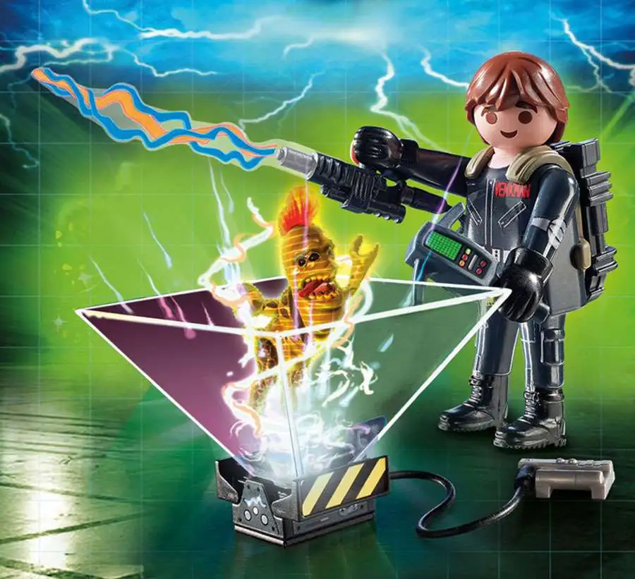 Peter Venkman With cool hologram effects (app download necessary). The clear ghost-trap cone acts as a projector when paired with a smartphone or tablet. Activate the app to capture ghosts inside the ghost cone!