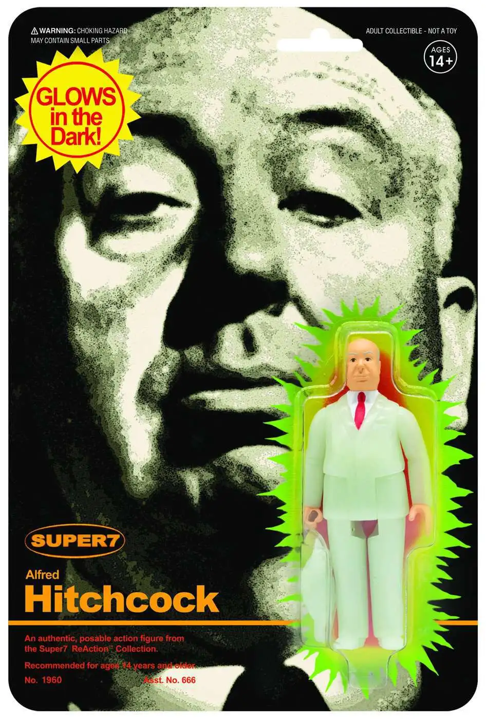 Any cinephile will recognize the Master of Suspense on sight. Now with the new glow-in-the-dark Alfred Hitchcock ReAction Figure, they wont even have to bring up the house-lights to see this peerless director. This 3.75 ReAction Figure is made of glow-in-the-dark plastic and comes with bird accessory in a nod to one of his most iconic films. A legend among legends, this glow-in-the-dark Alfred Hitchcock ReAction Figure will be a marquee addition to any film lovers collection. The packaging is a tribute to the iconic toy company Remco.