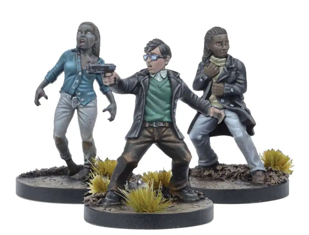 1 Plastic Julie Miniature, 1 Plastic Chris Miniature, 1 Plastic Walker Miniature, Julie Character Card, Chris Character Card, Glenn Character Card, Felling Axe, Grenade, Plice Vest, and UTAS-UTS-15 Equipment Cards. Miniatures supplied assembled and unpainted. Requires THe WAlking Dead: All Out War Miniatures GAme Core Set to play.