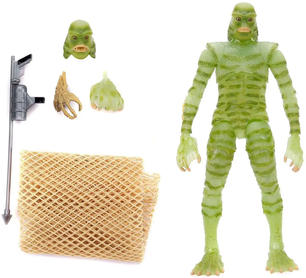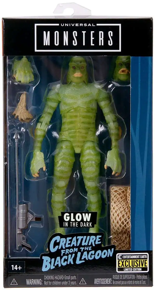 Collectors, cast your net for the elusive Universal Monsters Creature from the Black Lagoon Glow-in-the-Dark 6-Inch Action Figure -This Exclusive featuring a decidedly fishy appearance and disposition. Harboring a detailed paint job and a swimmingly articulated form, the Amazonian Gill-man is a sensational glow-in-the-dark figure that can be posed in a multitude of mannerisms using his alternate head sculpt, an alternate hand, a harpoon gun, a net, and a bony hand! The additional head and hand also glow. The Creature from the Black Lagoon out of the 1954 black-and-white film bearing its name is suitable for paleontologists ages 4 and up and comes packaged in a window display box. Quantities are limited, so order yours now before it gets away! Ages 14 & up.